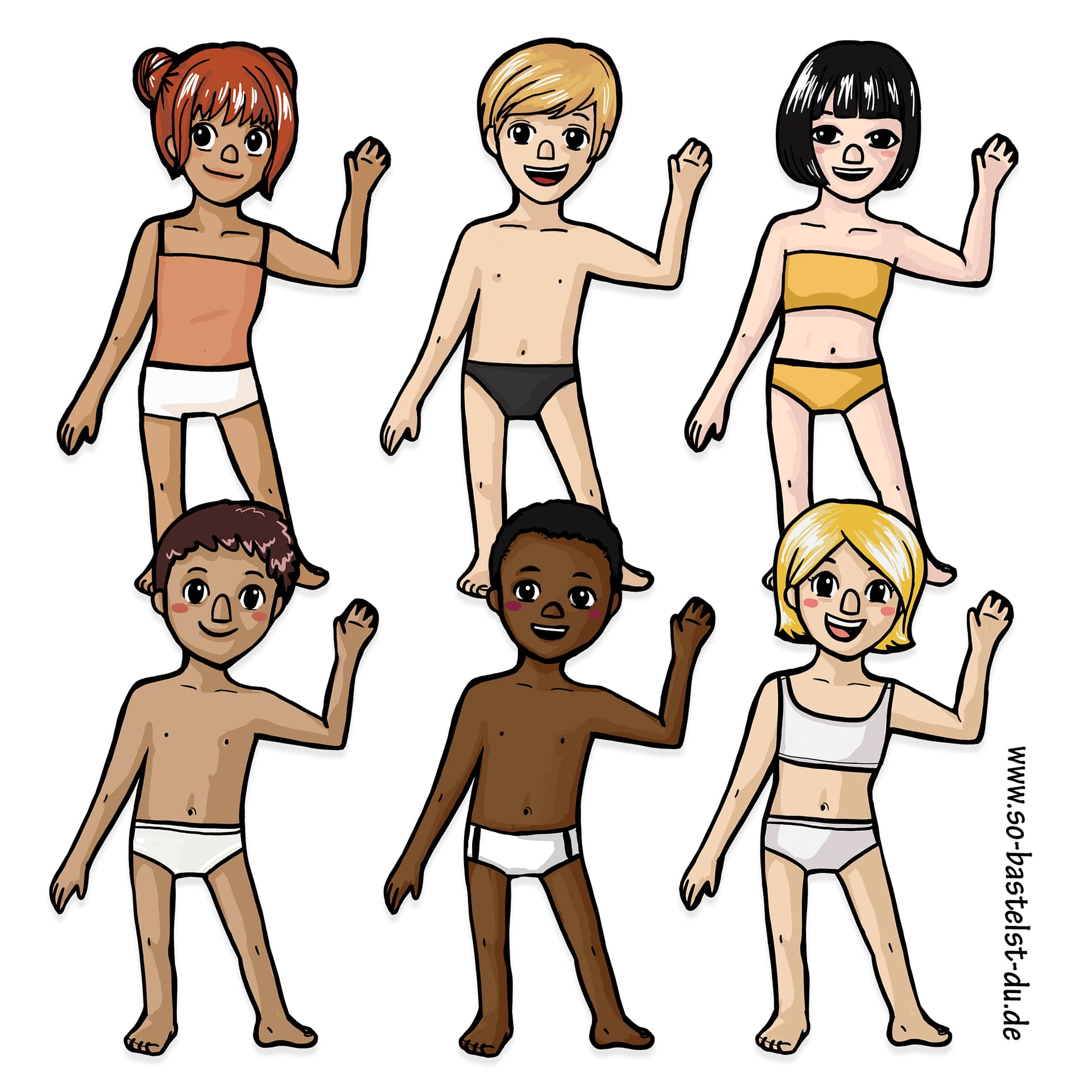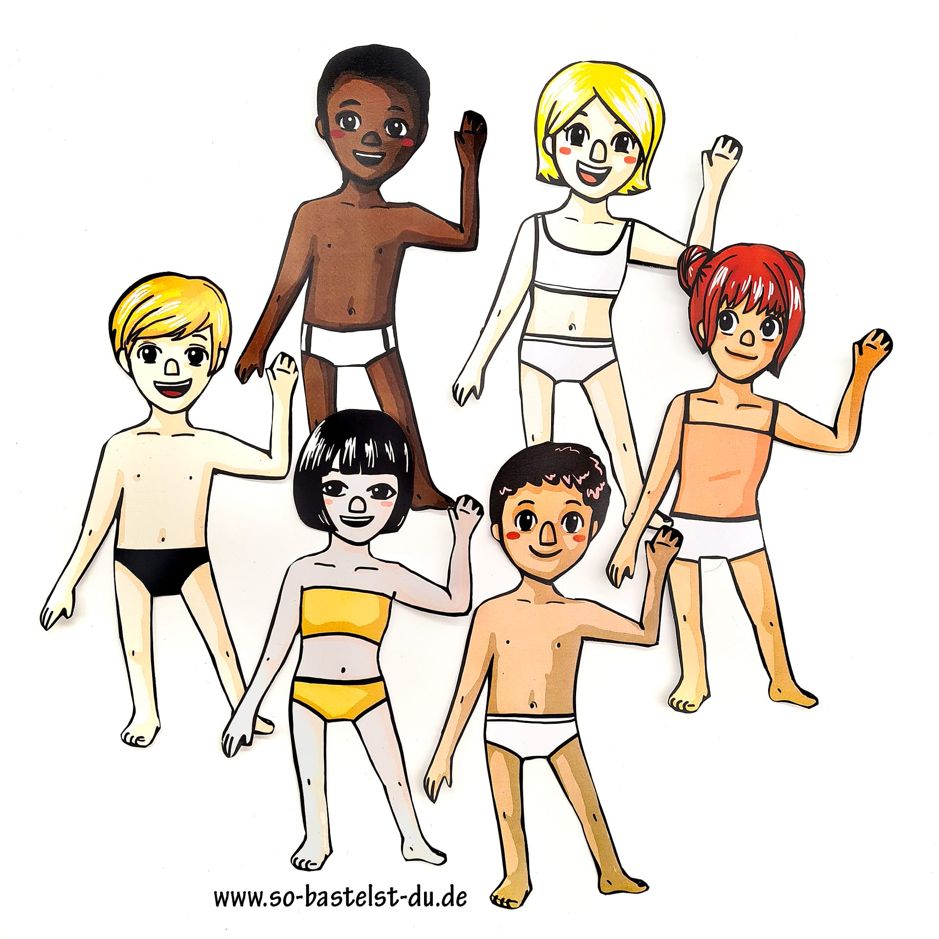 - 6 verschiedene Papier-Anziehpuppen (Mädchen und Jungen)