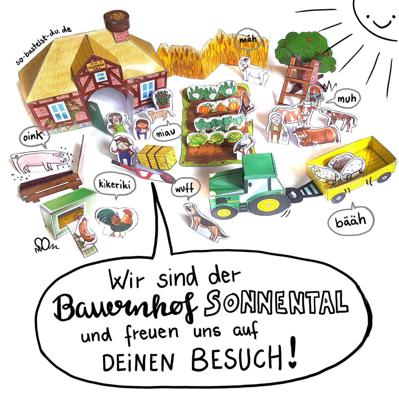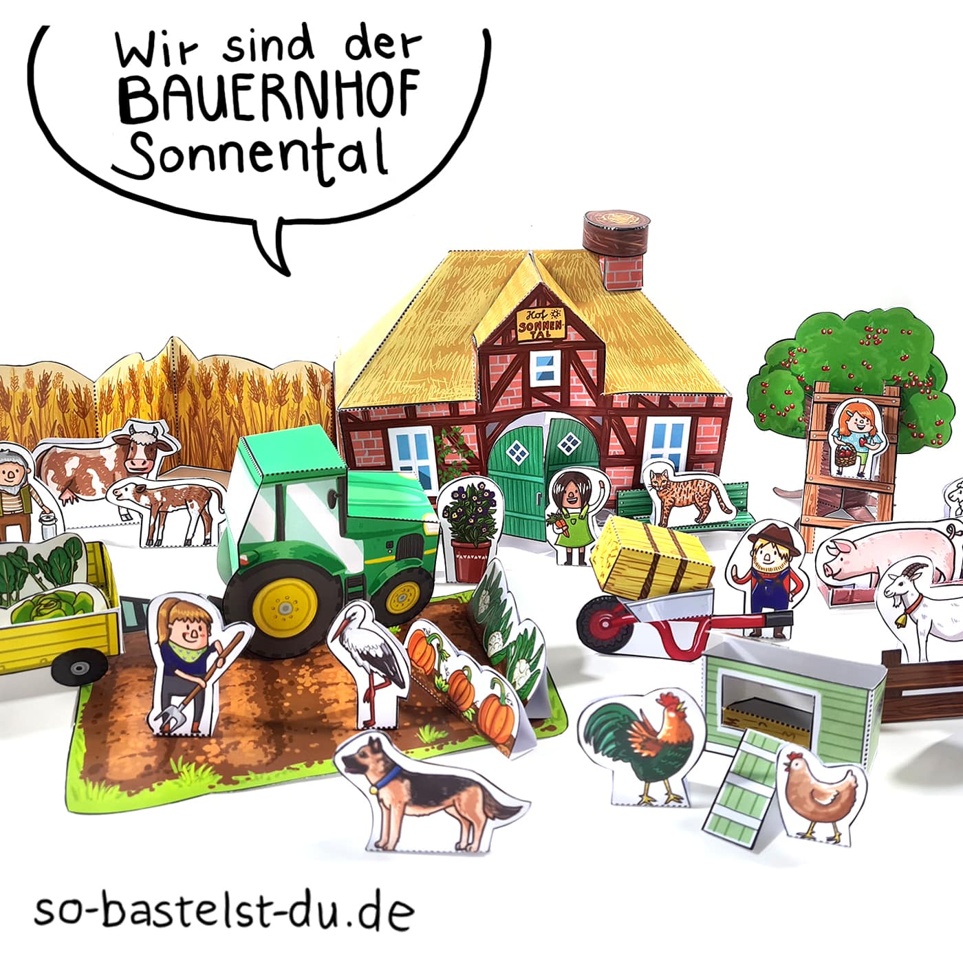 Mit dem Bastelbogen „Bauernhof Sonnental“ erwartet dich eine große Bauernhofwelt voller Tiere. Mit dabei ist außerdem ein großes Bauernhaus, ein Traktor mit Anhänger und vieles mehr!