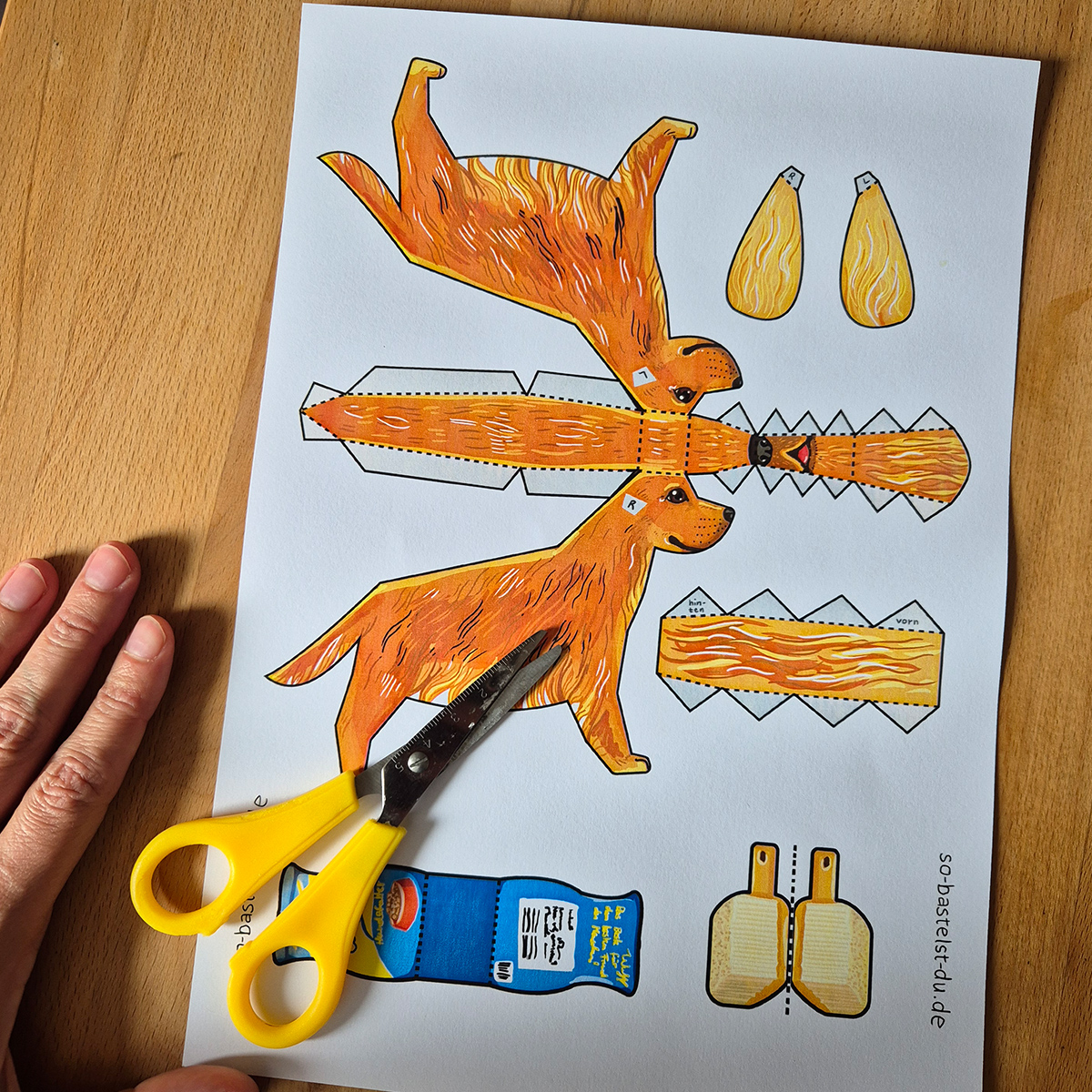 Als PDF-Vorlage kannst du Coco direkt herunterladen, ausdrucken und basteln. Mit ein paar Handgriffen entsteht ein liebevoller Papierhund, der dich immer anstrahlt und dein Bastelregal verschönert. Die Anleitung ist bebildert und gut verständlich.