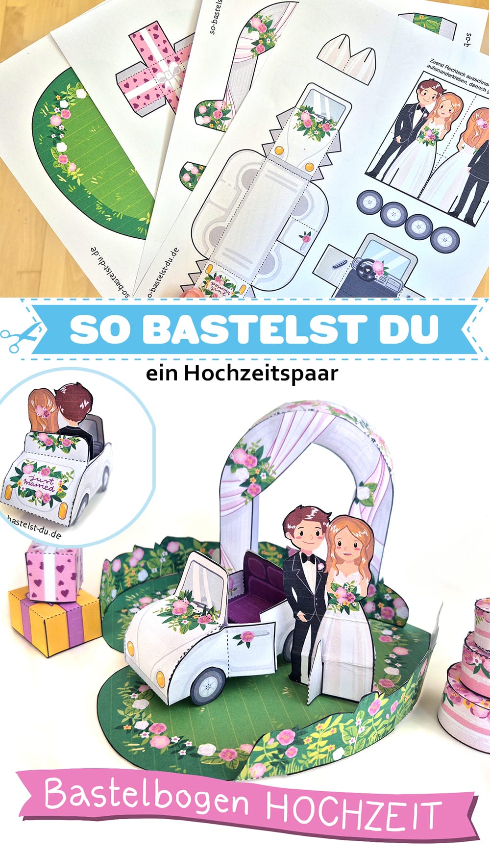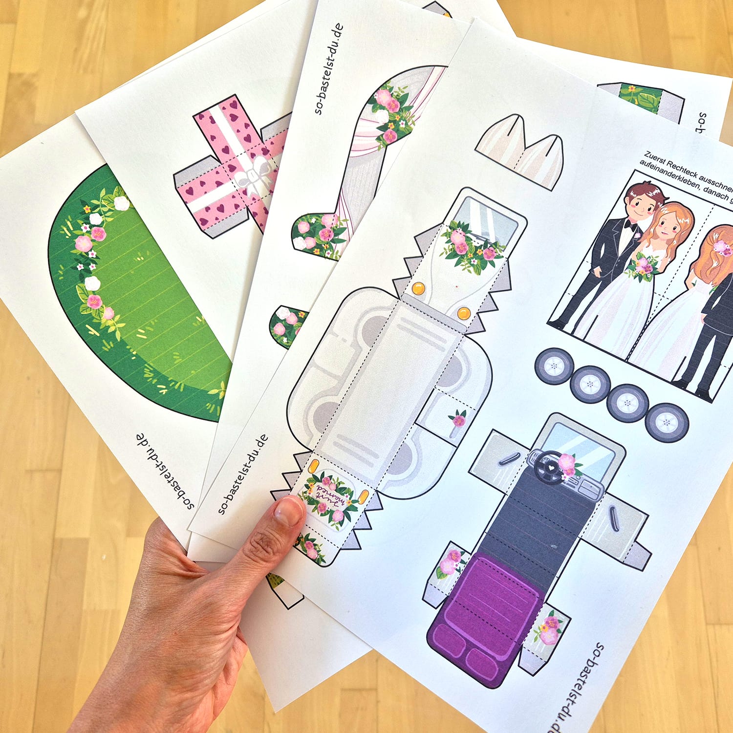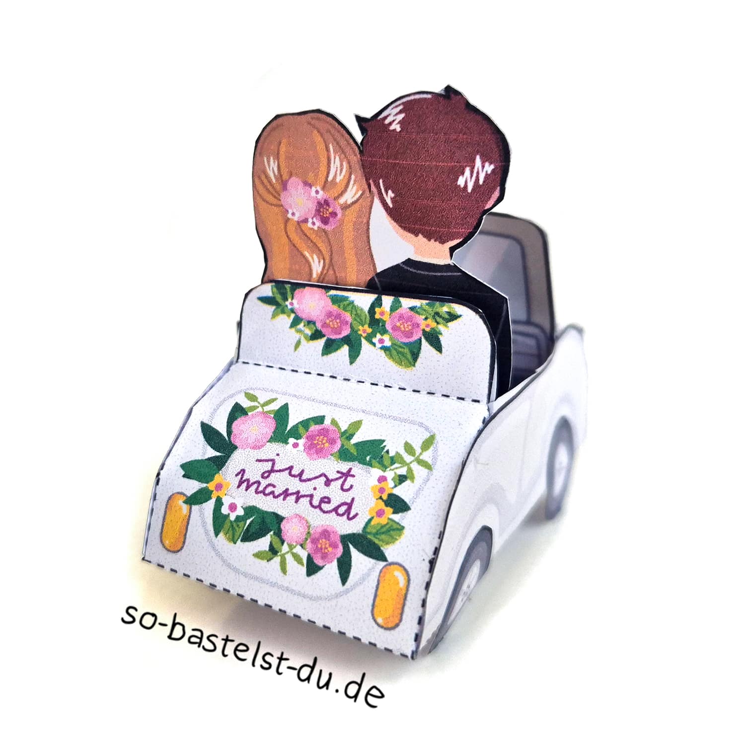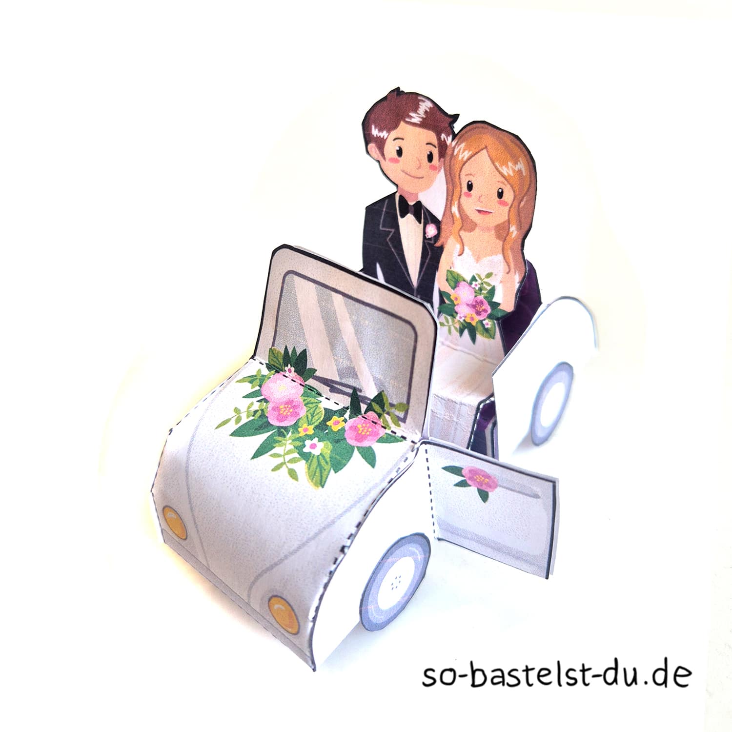 Unser Bastelbogen Hochzeit kann (gegen Aufpreis) individuell angepasst werden. Ob das Brautpaar nach einem Foto gestaltet werden soll (natürlich auch gern zwei Bräute oder zwei Bräutigame), das Auto eine andere Farbe bekommt oder die Blumendeko eurem Stil entspricht: Schreibt uns einfach an hallo@so-bastelst-du.de und nennt eure Ideen und Wünsche.