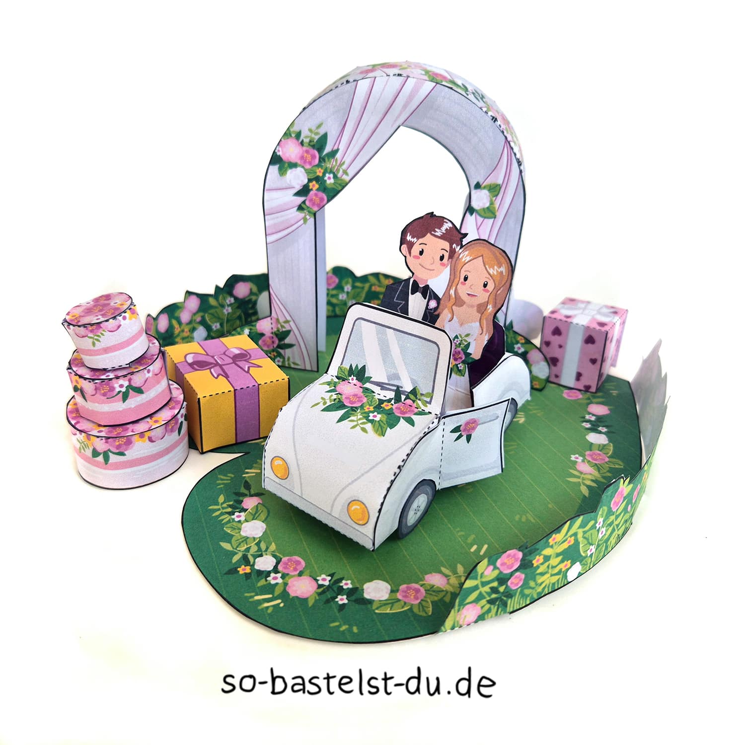Bastelvorlage zum Basteln eines Brautpaars mit Hochzeitsauto, Traubogen, Hochzeitstorte, Geschenken und herzförmiger Wiese.