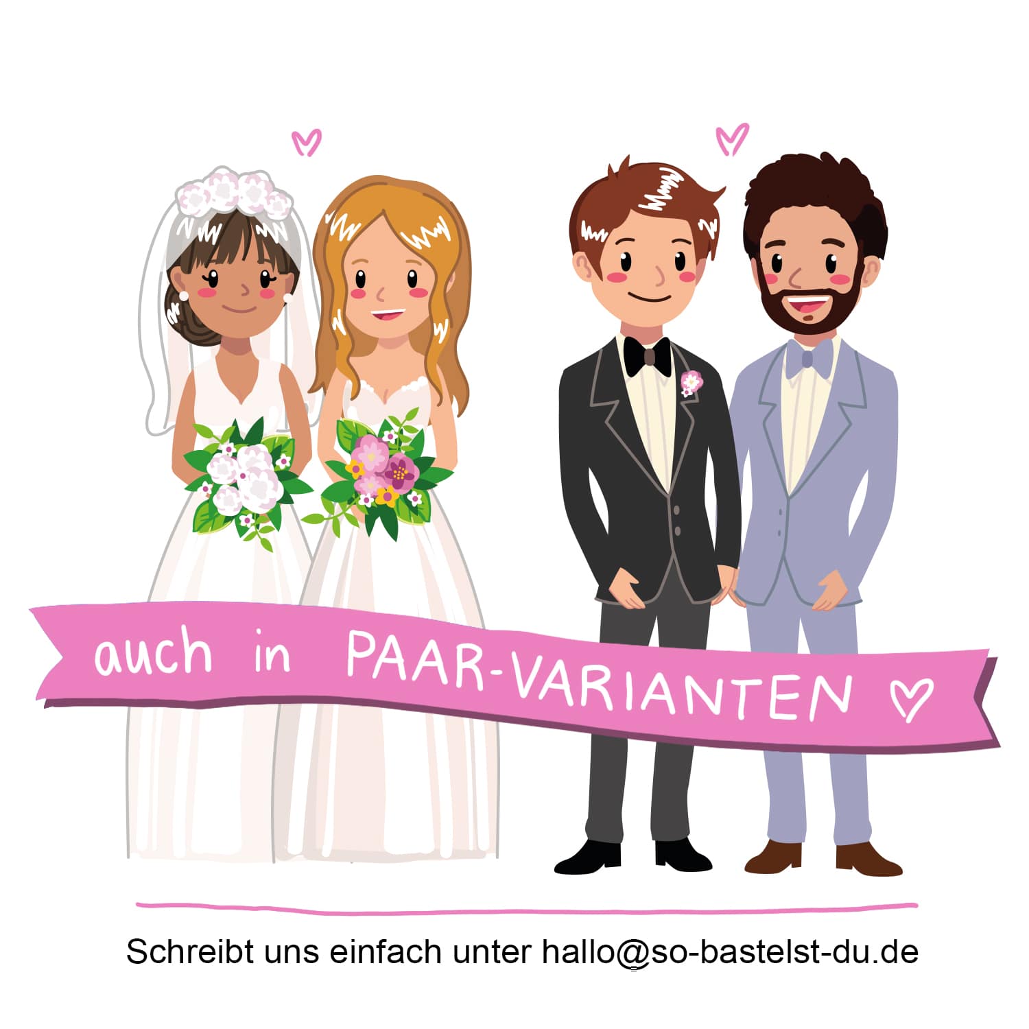 In Kürze wird es deshalb mehrere Versionen des Paares geben, die unterschiedlichste Konstellationen abbilden. Bis diese Optionen vollständig in unser System integriert sind, könnt ihr uns jederzeit unter hallo@so-bastelt-du.de kontaktieren. Wir senden euch dann gerne eine Version mit zwei Männern oder zwei Frauen zu (siehe Bild).