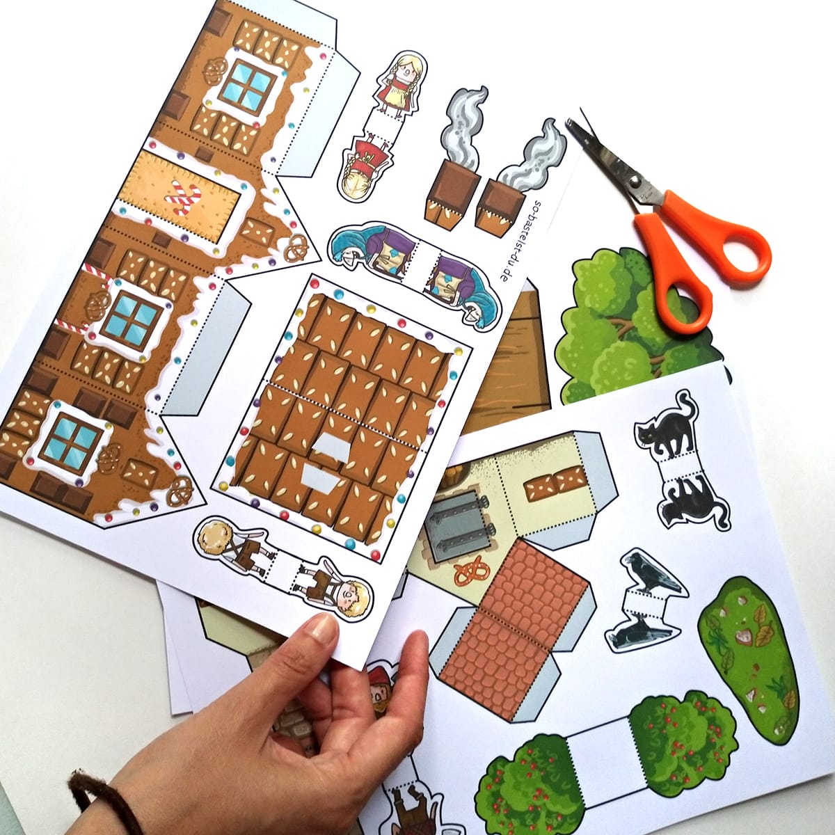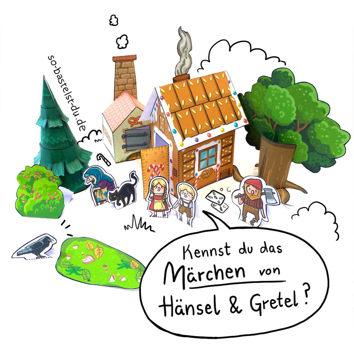 Mit dem Märchen-Bastelbogen „Hänsel und Gretel“ kannst du das beliebte Märchen um die beiden Kinder und das Hexenhaus selbst nachspielen!