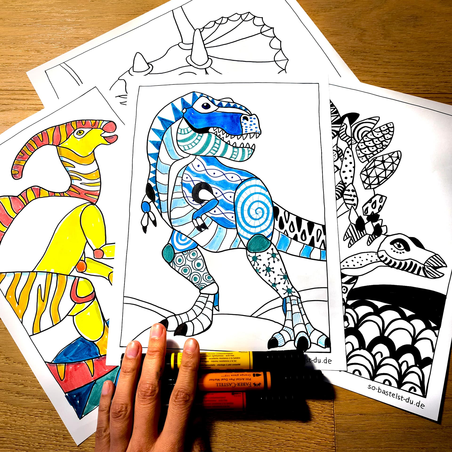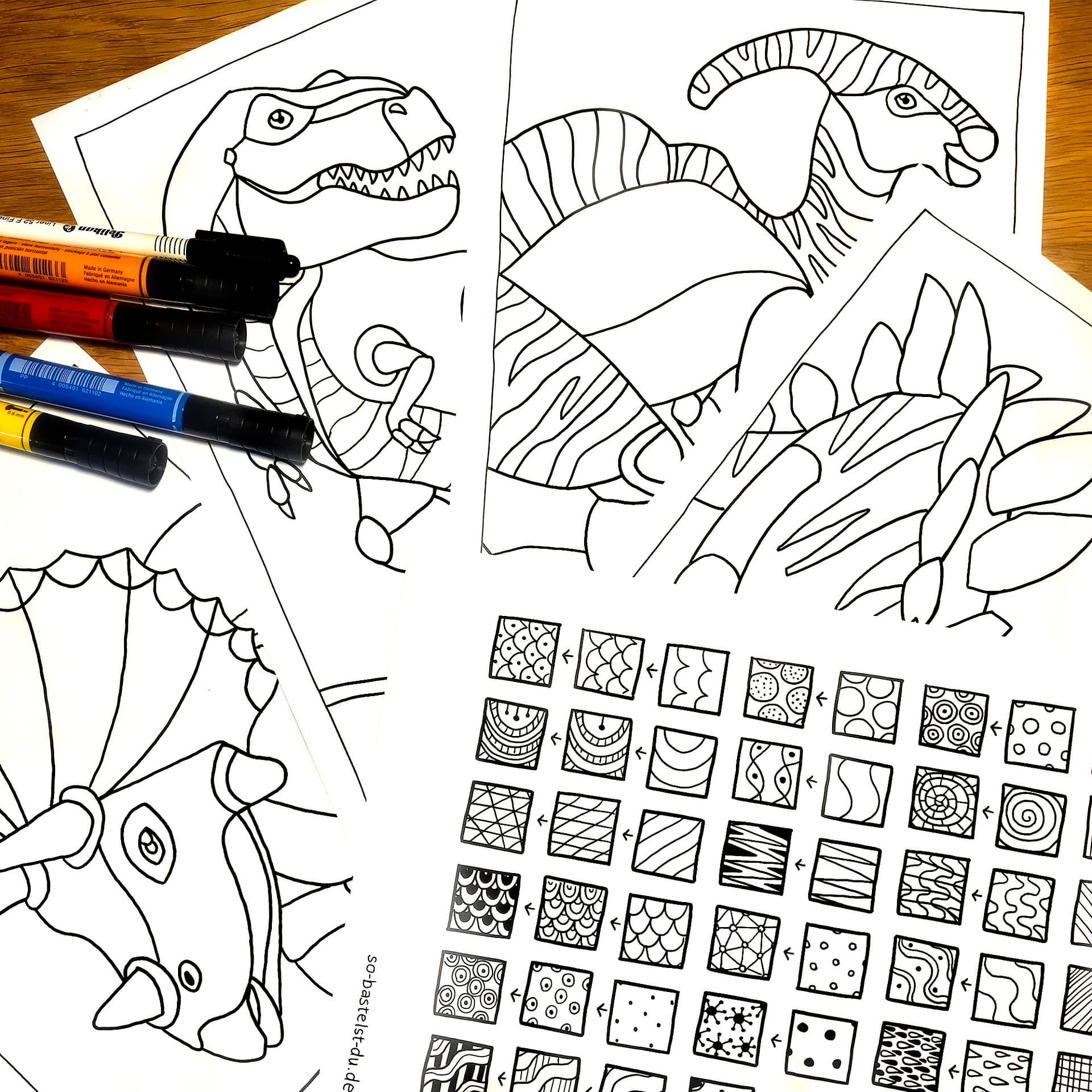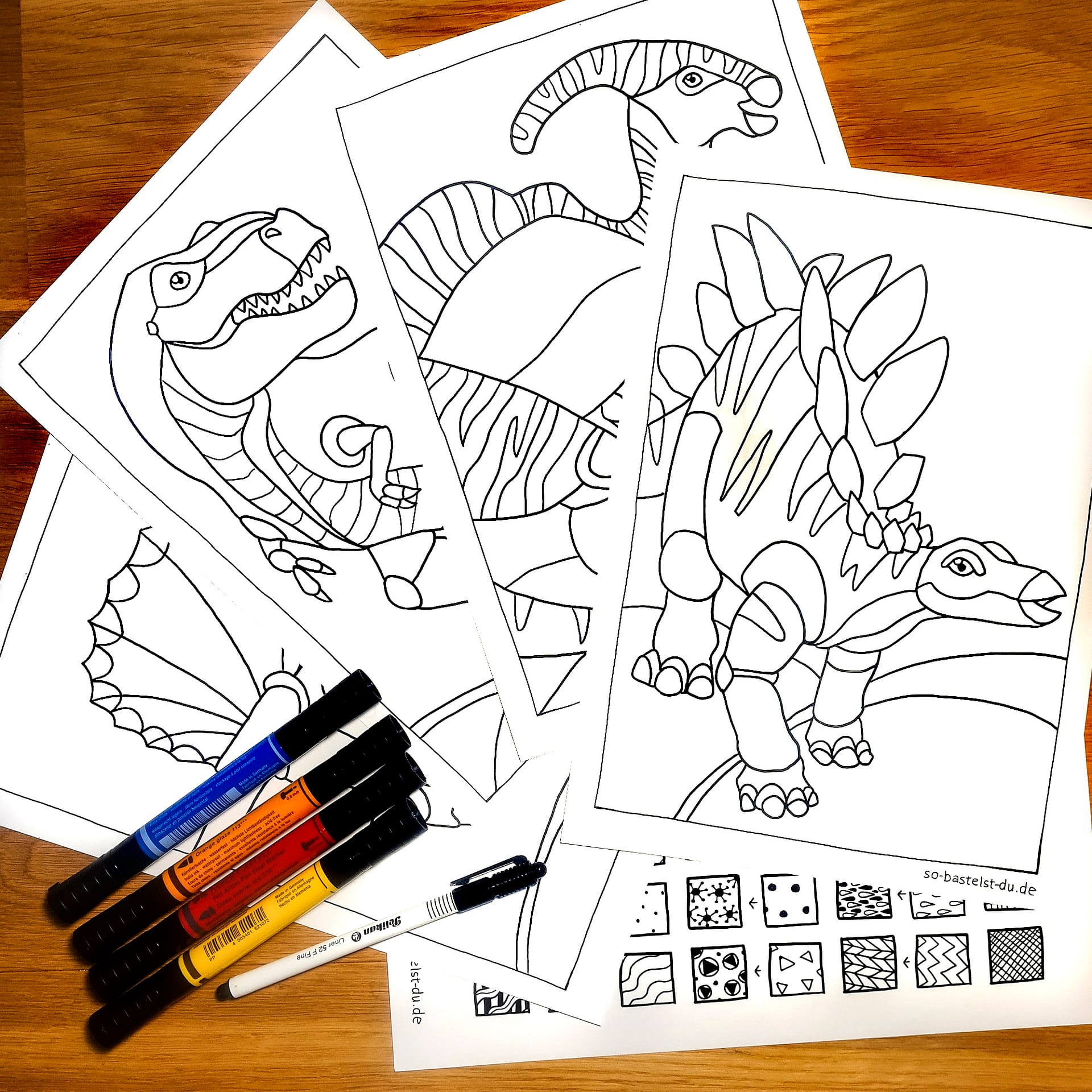 Drucke die Dinosaurier Ausmalbilder aus und bemale sie. Du kannst dafür die mitgelieferte Mustervorlage verwenden oder ganz frei drauflos malen.